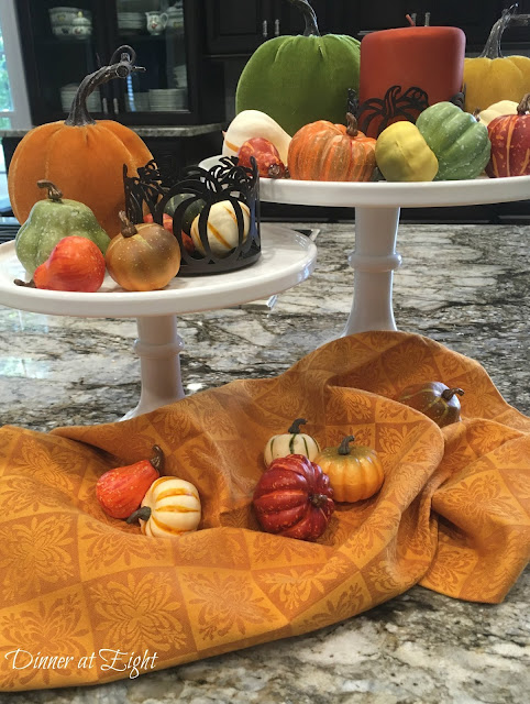 I've used mostly pumpkins in this autumn's vignettes, a bit of a change from those I've done previously. On the kitchen island I used multiple colors and shapes on two cake stands. A coordinating towel bunched around their bases adds warmth to the cool colors of the granite.